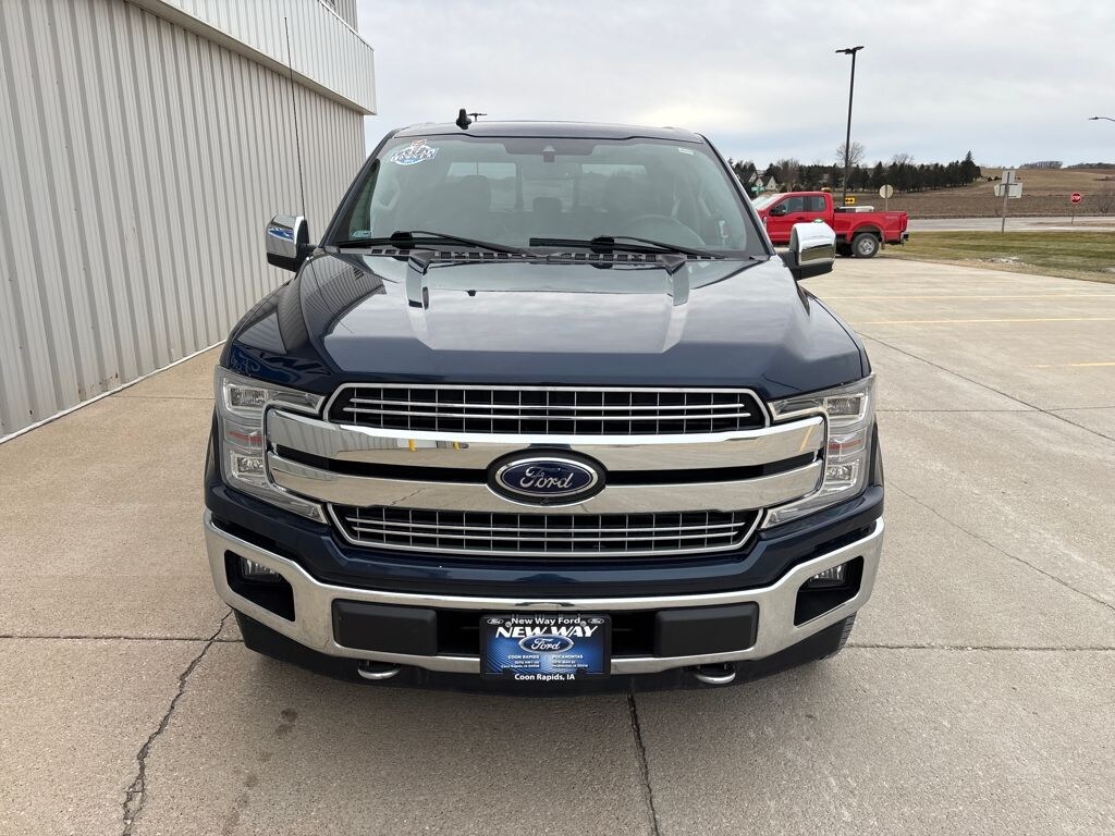 Complimentary Oil Changes For Life, 4X4, Apple CarPlay, Backup Camera, Bluetooth, 4WD, 110V/400W Outlet, 2nd Row Heated Seats, Chrome 2-Bar Grille w/4 Minor Bars, Chrome Angular Step Bars, Chrome Door & Tailgate Handles w/Body-Color Bezel, Chrome Skull Caps on Exterior Mirrors, Equipment Group 502A Luxury, GVWR: 7,050 lbs Payload Package, Heated Steering Wheel, Lariat Bed Utility Package, Lariat Chrome Appearance Package, Leather-Trimmed Bucket Seats, LED Sideview Mirror Spotlights, Memory seat, Pedal memory, Power driver seat, Power Glass Sideview Mirr w/Chrome Skull Caps, Power Tilt/Telescoping Steering Column w/Memory, Quad Beam LED Headlamps & LED Taillamps/Fog Lamps, Radio: B&O Sound System by Bang & Olufsen, Rain-Sensing Wipers, Remote Start System w/Remote Tailgate Release, Reverse Sensing System, Single-Tip Chrome Exhaust, Universal Garage Door Opener, Wheels: 18" Chrome-Like PVD, Windshield Wiper De-Icer. Blue 2020 Ford F-150 Lariat 4D SuperCrew 4WD 10-Speed Automatic 3.5L V6 EcoBoost